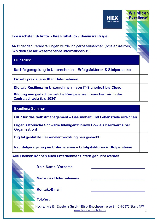 An folgenden Veranstaltungen würde ich gerne teilnehmen (bitte ankreuzen). Schicken Sie mir weitergehende Informationen zu. Die Veranstaltungen können auch unternehmensintern durchgeführt werden.